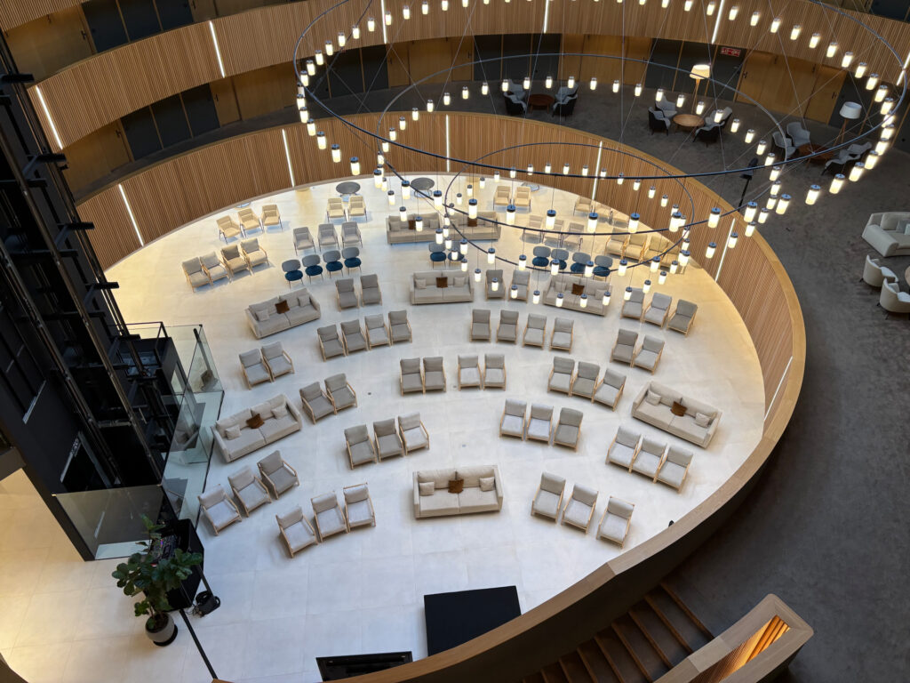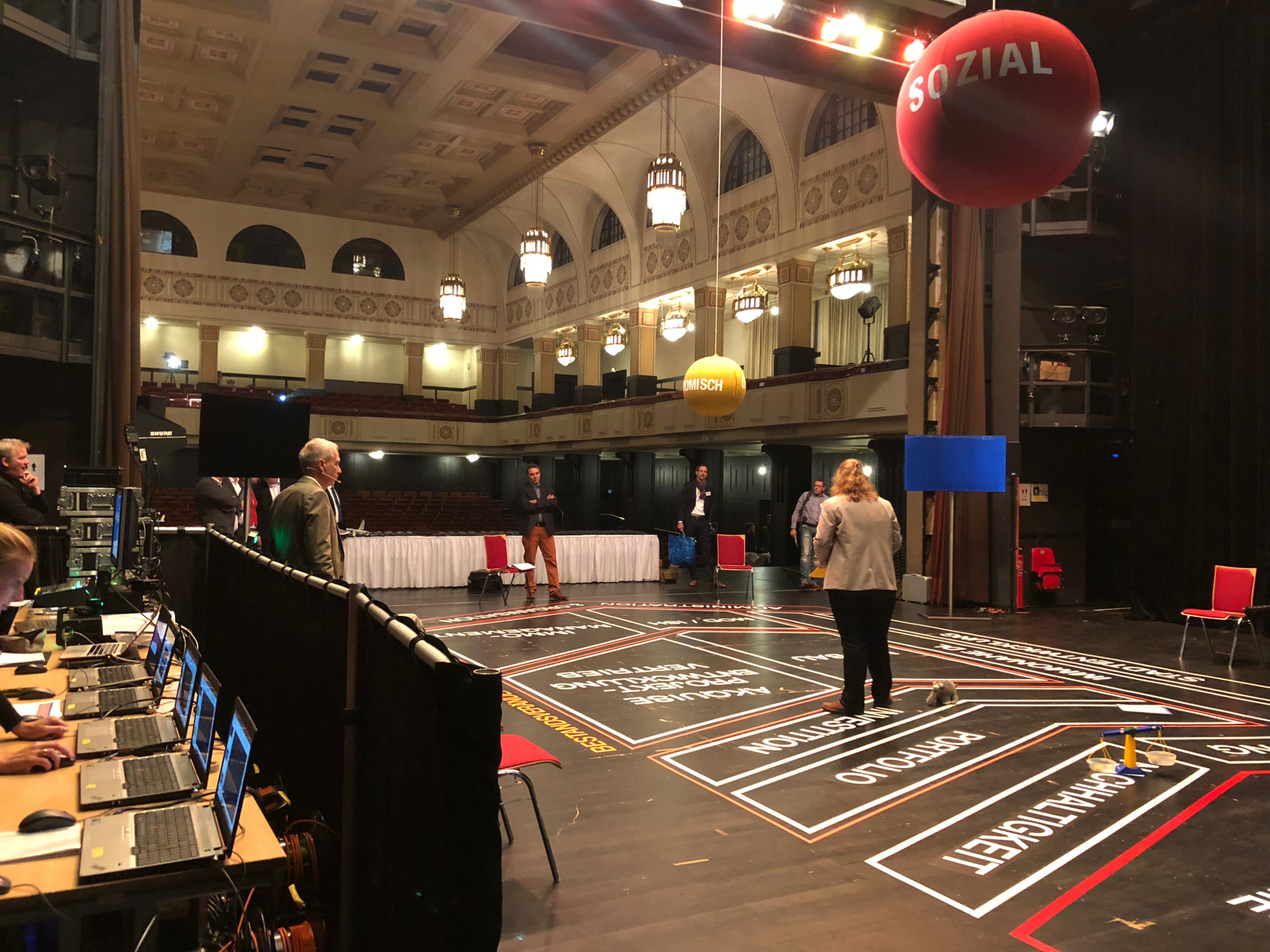 In Zentrum der Arena eine offene Plattform: Die Bühne als Ort, der zu allem werden kann – Fokuspunkt, Spielfeld, Resonanzfläche. Drum herum: im Außen verteilte Tische als Inseln der Interaktion. Diskutierende Menschen, individuell und trotzdem vernetzt über eine gemeinsame Plattform, um in Echtzeit Gedanken und Ideen zu bündeln und zu voten. Die Teilnehmenden nicht alsTeil des Geschehens, sondern als Protagonisten: sichtbar, ansprechbar, wirksam.