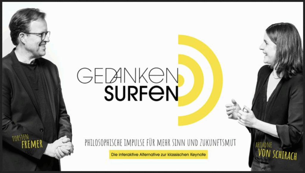 Ob Sinn oder Glück, Verantwortung oder Wertschätzung – die Themen sind ernst, die Haltung leicht. Kein Vortrag, kein Hype. Kein Workshop, keine PowerPoint Show – sondern ein interaktives Format, das Gedankensurfen ermöglicht und bei dem die Teilnehmenden ihre Störgefühle und Hoffnungen artikulieren und spüren können und dürfen: Du bist nicht allein mit deinen Fragen – und gemeinsam wird Zukunft mutiger.
