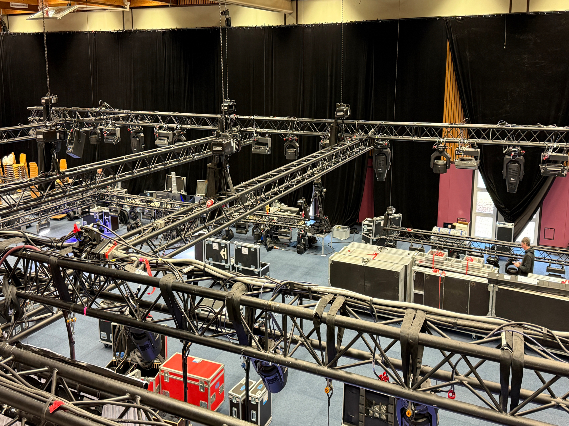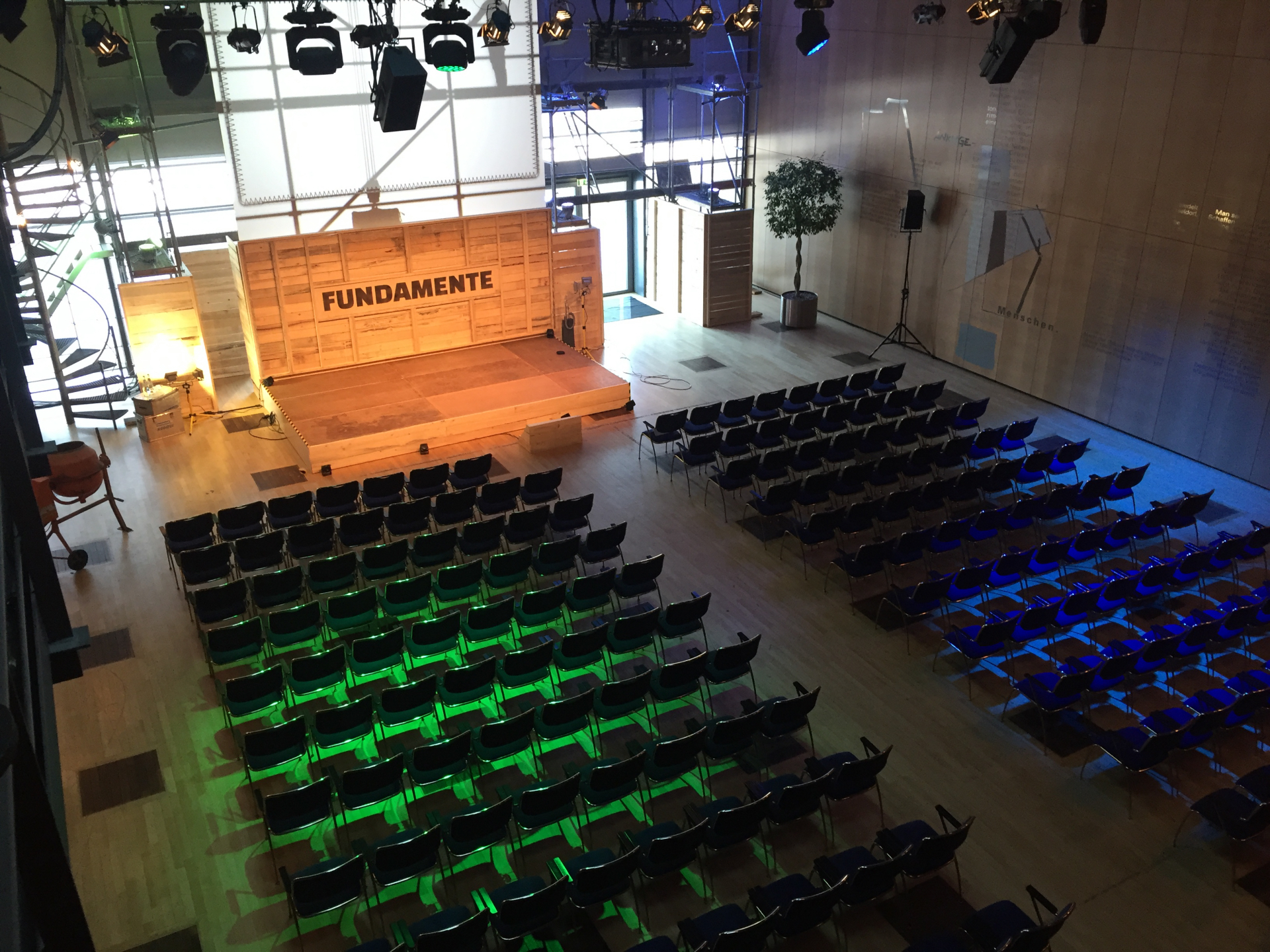 In Zentrum der Arena eine offene Plattform: Die Bühne als Ort, der zu allem werden kann – Fokuspunkt, Spielfeld, Resonanzfläche. Drum herum: im Außen verteilte Tische als Inseln der Interaktion.